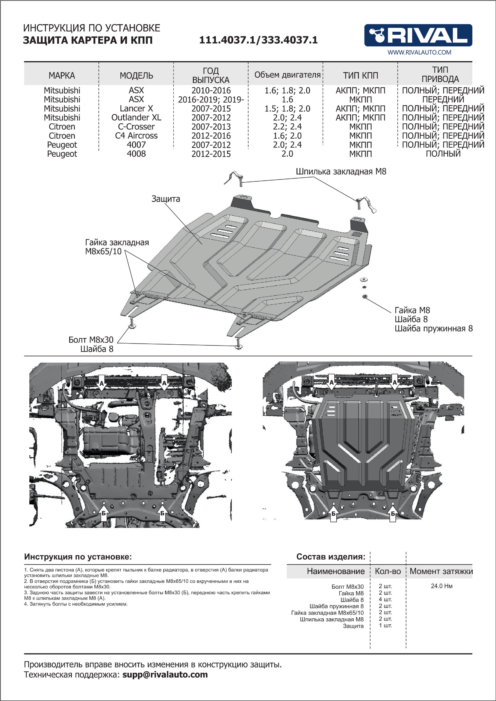 333.4037.1 | Rival | Защита картера + КПП (алюминий 3 мм) + комплект крепежа для Mitsubishi Outlander XL 2007-2012 (V - 2.0; 2.4), Peugeot 4007 2007-2012 (V - 2.0; 2.4), Peugeot 4008 2012-2015 (V - 2.0), Mitsubishi ASX 2019-2022 (V - 1.6), Mitsubishi ASX 2017-2019 (V - все), Citroen C4 Aircross 2012-2016 (V - 1.6; 2.0), Citroen C-Crosser 2007-2013 (V - 2.2d; 2.4), Mitsubishi ASX 2010-2015 (V - все), Mitsubishi Lancer X 2007-2016 (V - 1.5; 1.8; 2.0) | 12 070 ₽ |