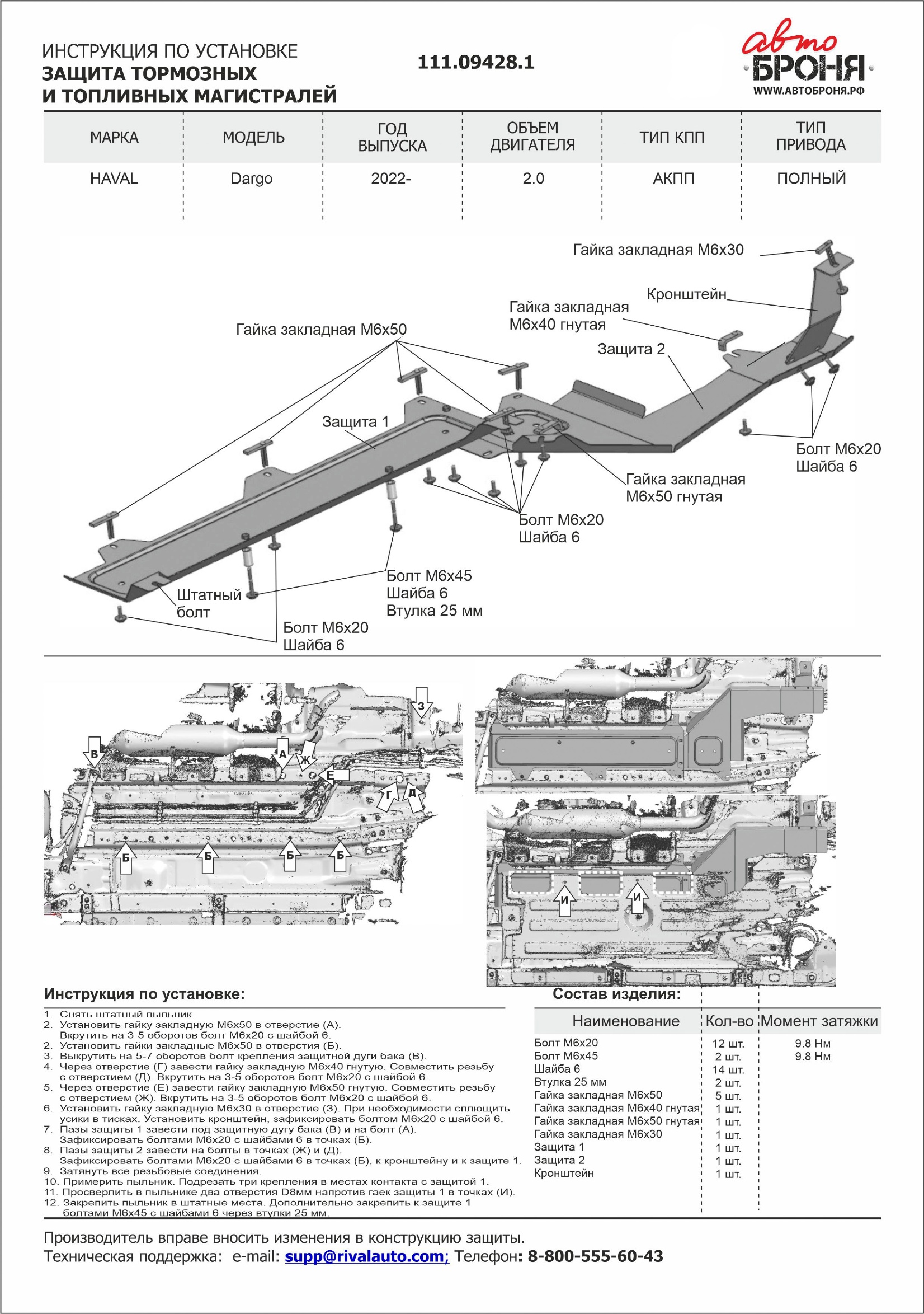 111.09428.1 | АвтоБроня | Защита топливных и тормозных магистралей (сталь 1,4 мм) + комплект крепежа для Haval Dargo 2022- (V - 2.0) | 3 880 ₽ |