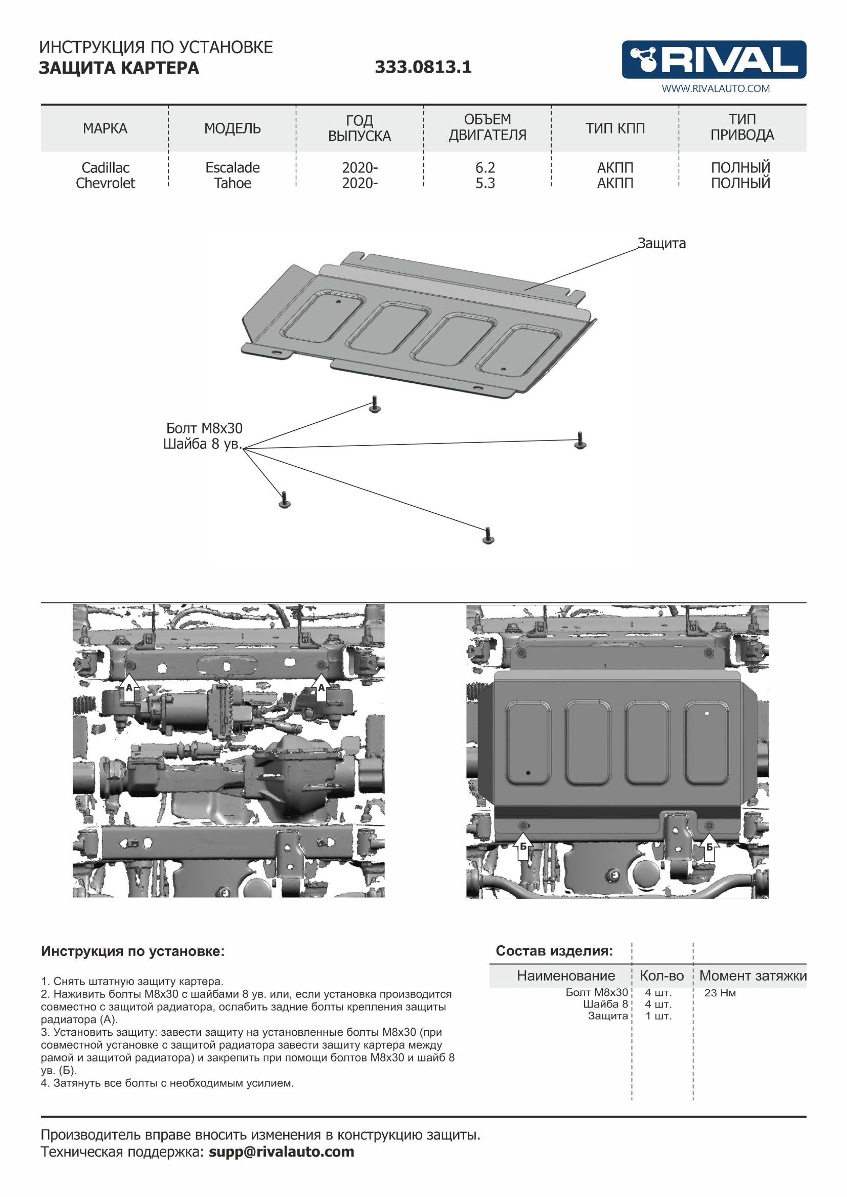 333.0813.1 | Rival | Защита картера (алюминий 3,8 мм) + комплект крепежа для Cadillac Escalade 2020- (V - 6.2), Chevrolet Tahoe 2020- (V - 5.3) | 9 240 ₽ |