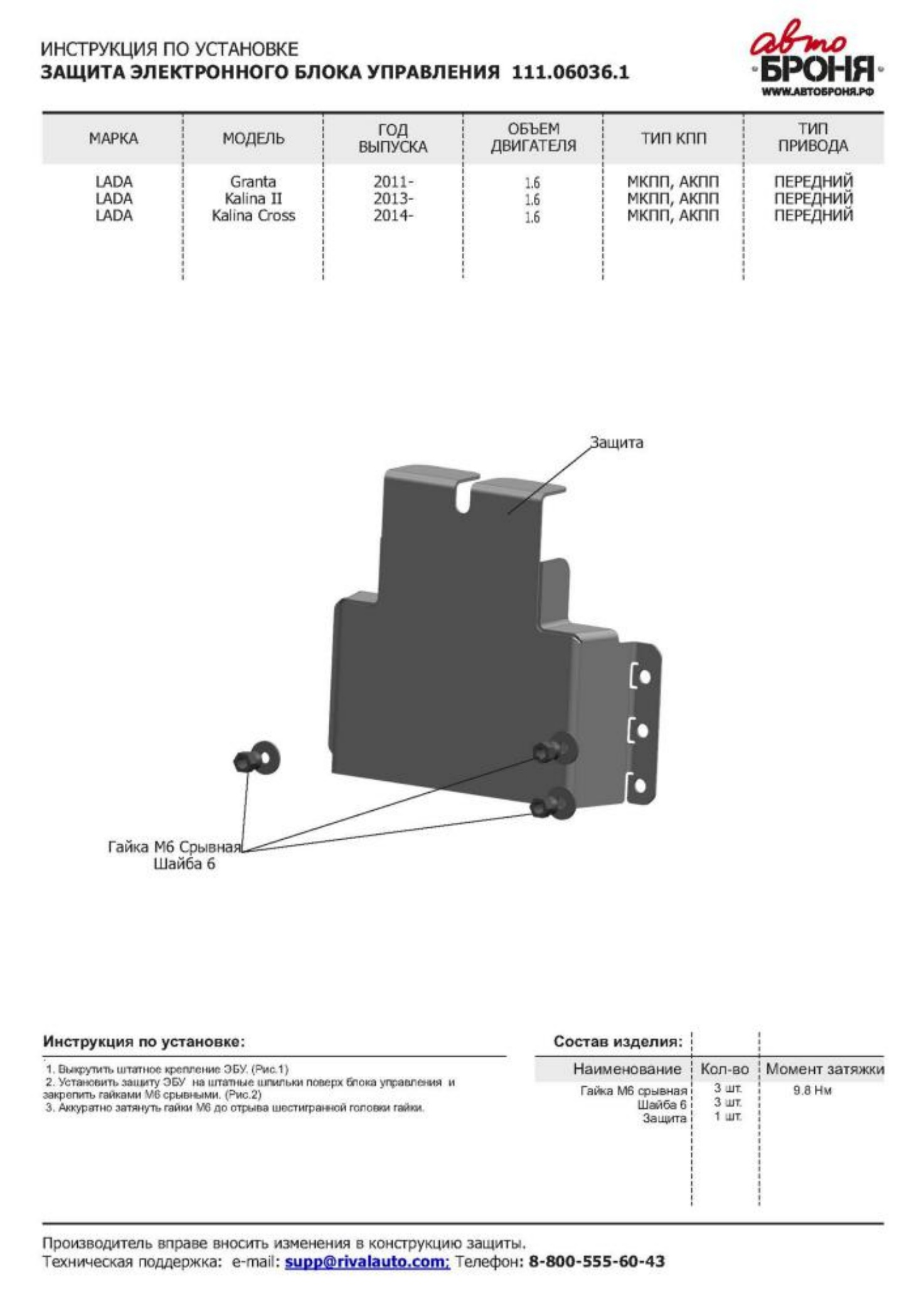 111.06036.1 | АвтоБроня | Защита электронного блока управления (сталь 1,5 мм) + комплект крепежа для Lada Granta 2011- (V - 1.6), Lada Kalina 2013-2018 (V - 1.6), Lada Kalina Cross 2014-2018 (V - 1.6) | 3 390 ₽ |