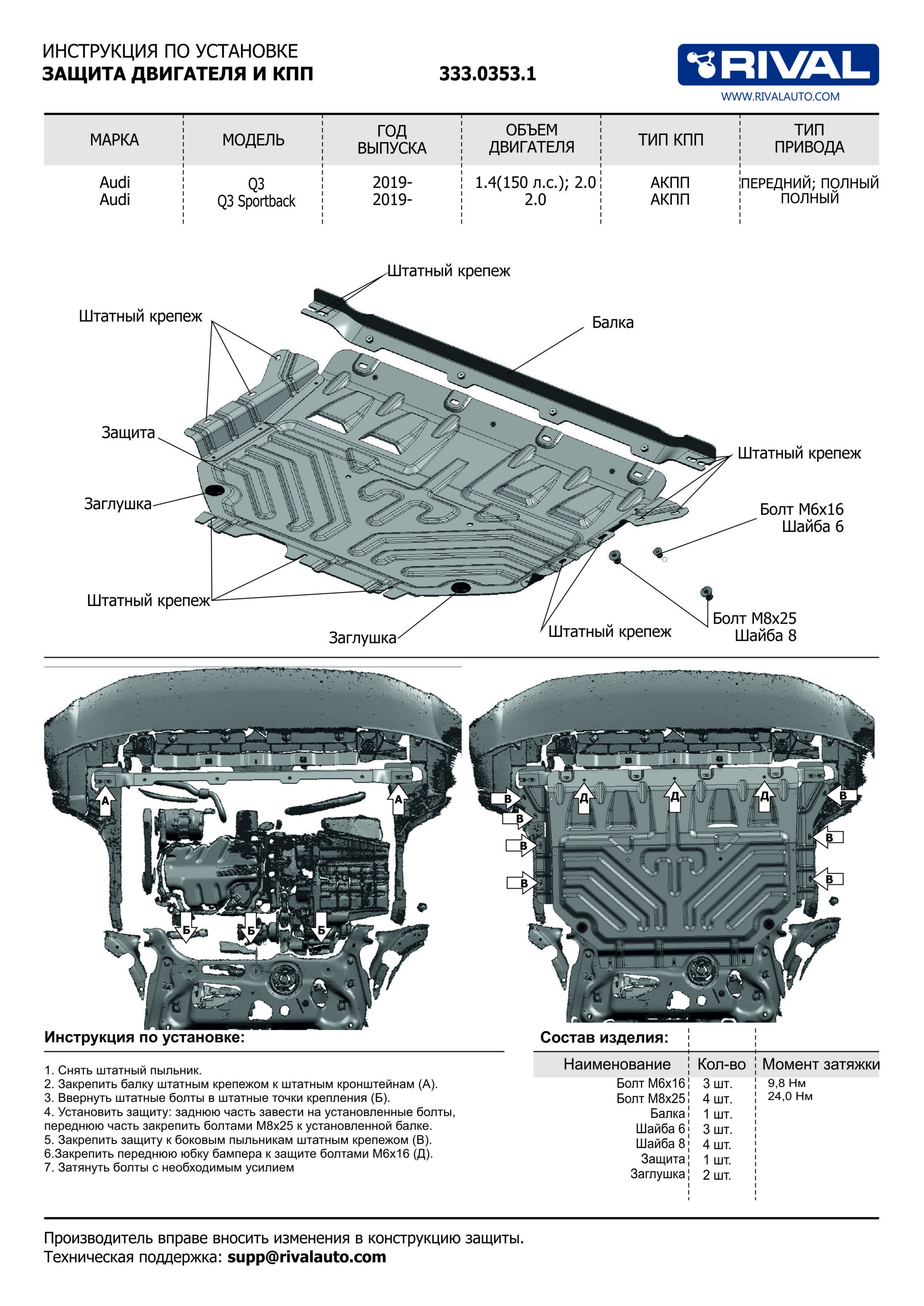 333.0353.1 | Rival | Защита картера + КПП (алюминий 3 мм) + комплект крепежа для Audi Q3 2019-2025 (V - 1.4; 2.0), Audi Q3 Sportback 2019-2025 (V - 2.0, 4WD) | 24 240 ₽ |