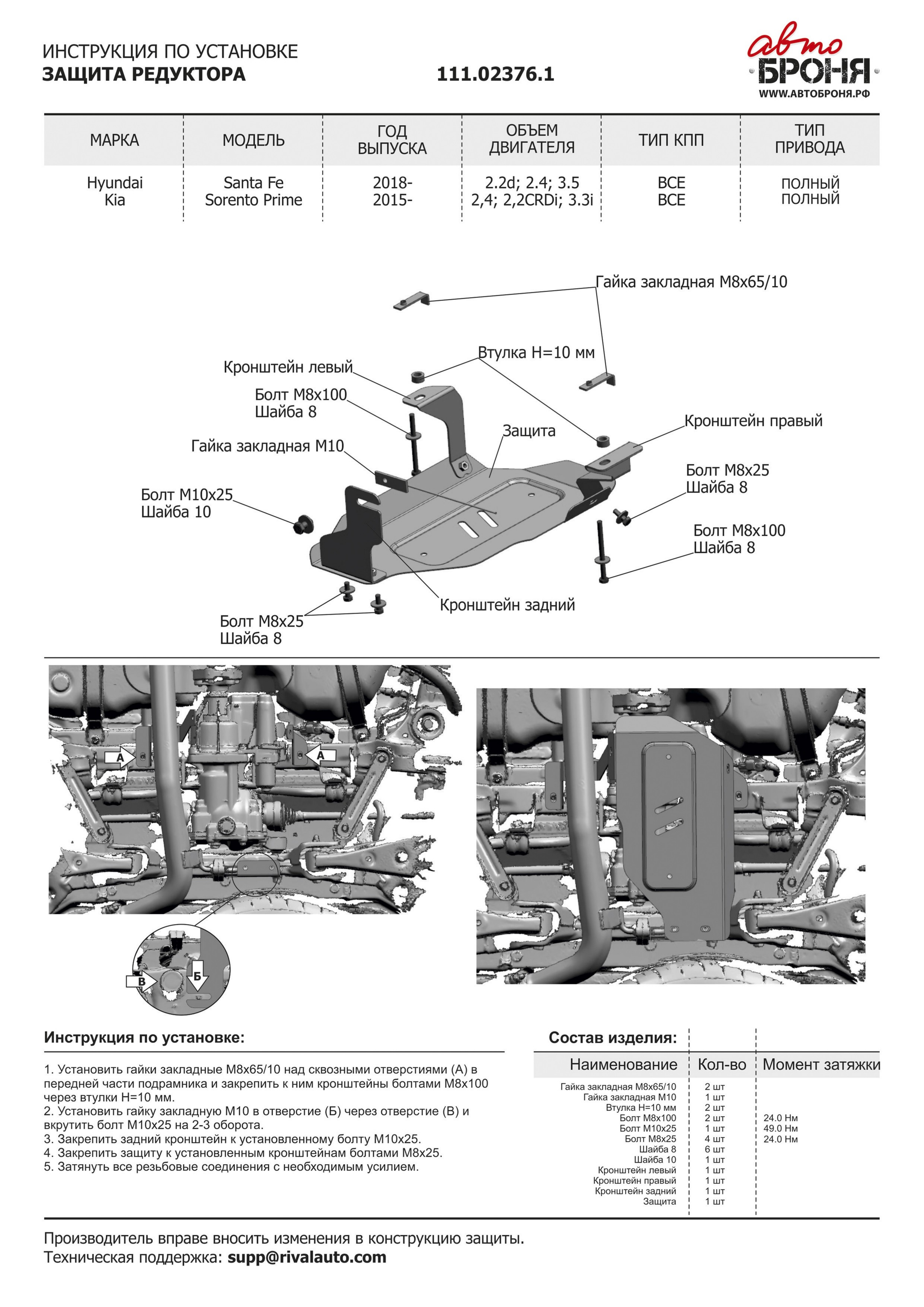 111.02376.1 | АвтоБроня | Защита редуктора (сталь 1,8 мм) + комплект крепежа для Hyundai Santa Fe 2018-2021 (V - 2.2d; 2.4; 3.5), Kia Sorento Prime 2015-2020 (V - 2.4; 2.2d; 3.3) | 4 060 ₽ |