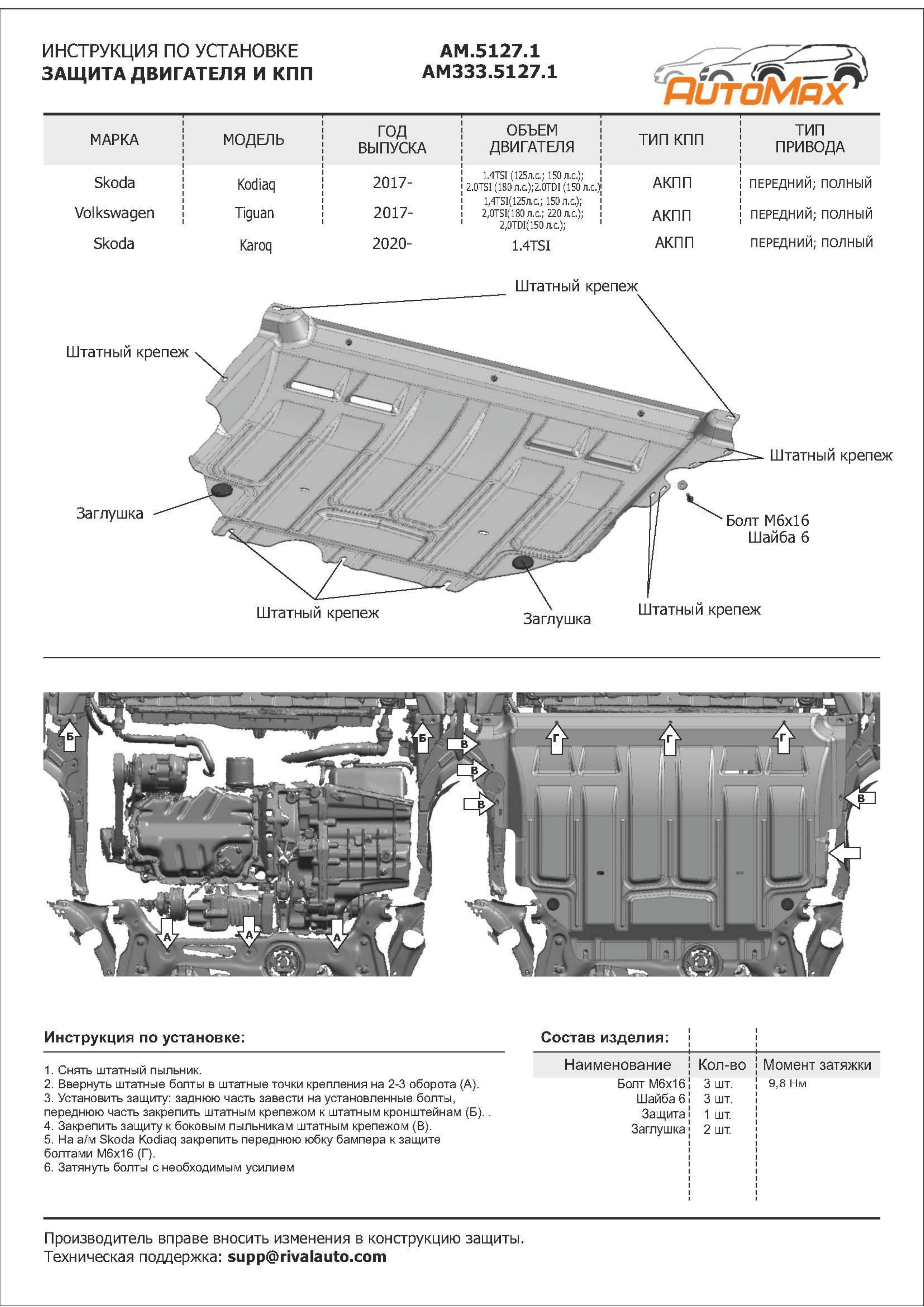 AM.5127.1 | AutoMax | Защита картера + КПП (сталь 1,4 мм) + комплект крепежа для Skoda Kodiaq 2017-2023 (V - 1.4TSI 125 л.с.; 150 л.с.; 2.0TSI 180 л.с.; 2.0d 150 л.с., с Webasto), Volkswagen Tiguan 2016-2024 (V - 1.4 125 л.с., 150 л.с.; 2.0d 150 л.с.; 2.0 180 л.с., 220 л.с.), Volkswagen Taos 2021- (V - 1.4 150 л.с.), Skoda Karoq 2020- (V - 1.4 150 л.с.) | 4 480 ₽ |