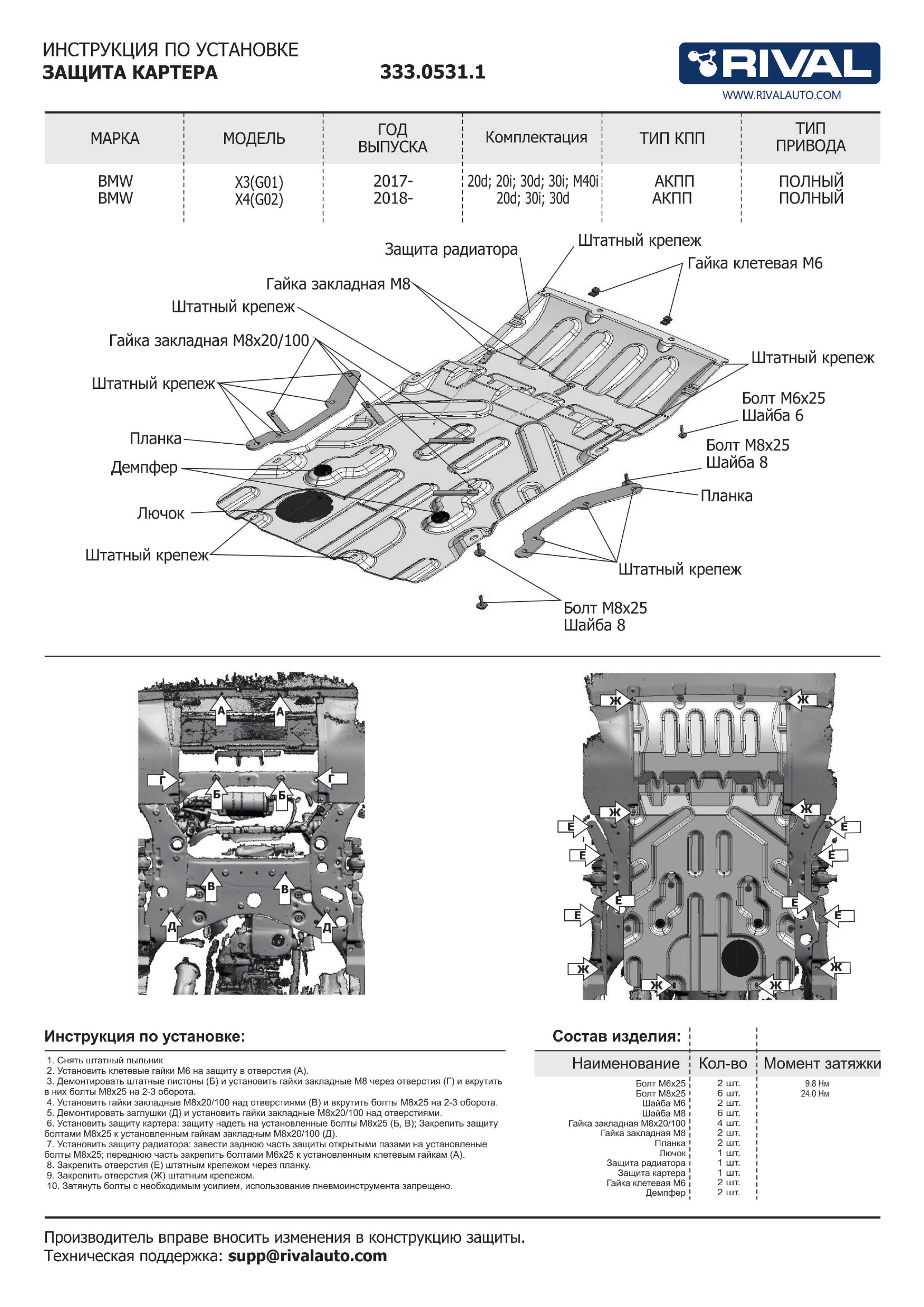 333.0531.1 | Rival | Защита картера (алюминий 4 мм) + комплект крепежа для BMW X3 G01 2017-2024 (20i; 20d; 30d; 30i; M40i; M40d), BMW X4 2018- (20i; 20d; 30i; 30d; M40i) | 33 470 ₽ |